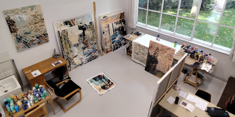 Le paysage, au cœur de son œuvre, ne se présente jamais comme une image stable, mais comme un espace en perpétuelle transformation, fragmenté puis recomposé. Par un travail de déconstruction et d’abstraction, il devient un territoire mental où se superposent mémoire, expérience et regard, donnant naissance à des scénarios imaginaires, entre évocation et réminiscence.